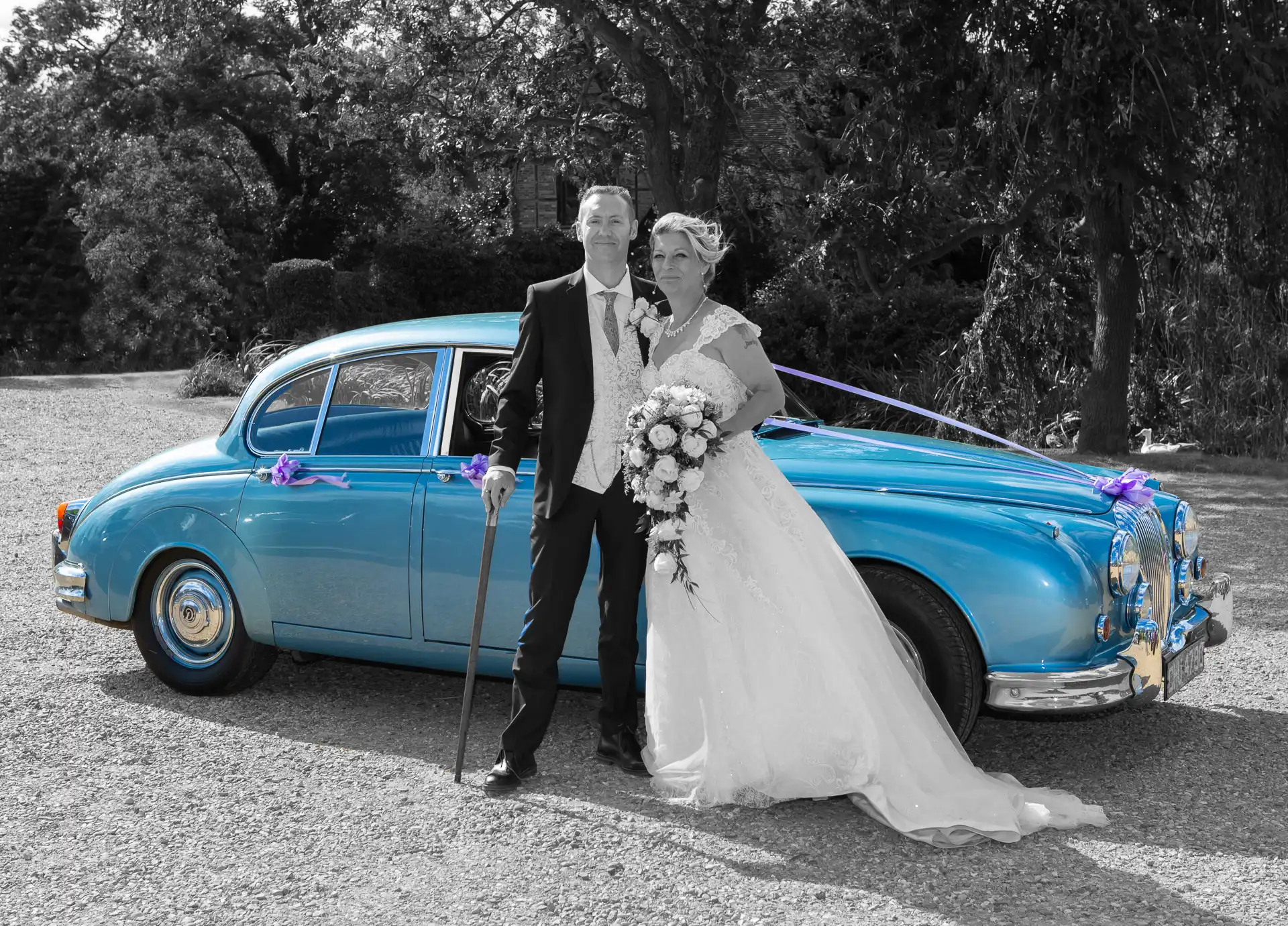 The bride wore a striking purple cape over her wedding dress, adding a bold splash of colour to the day. After the ceremony, the couple released doves—a poignant moment captured beside the manor’s tranquil lake. Their portraits were taken throughout the grounds, showcasing the venue’s gardens, architecture, and romantic ambiance.